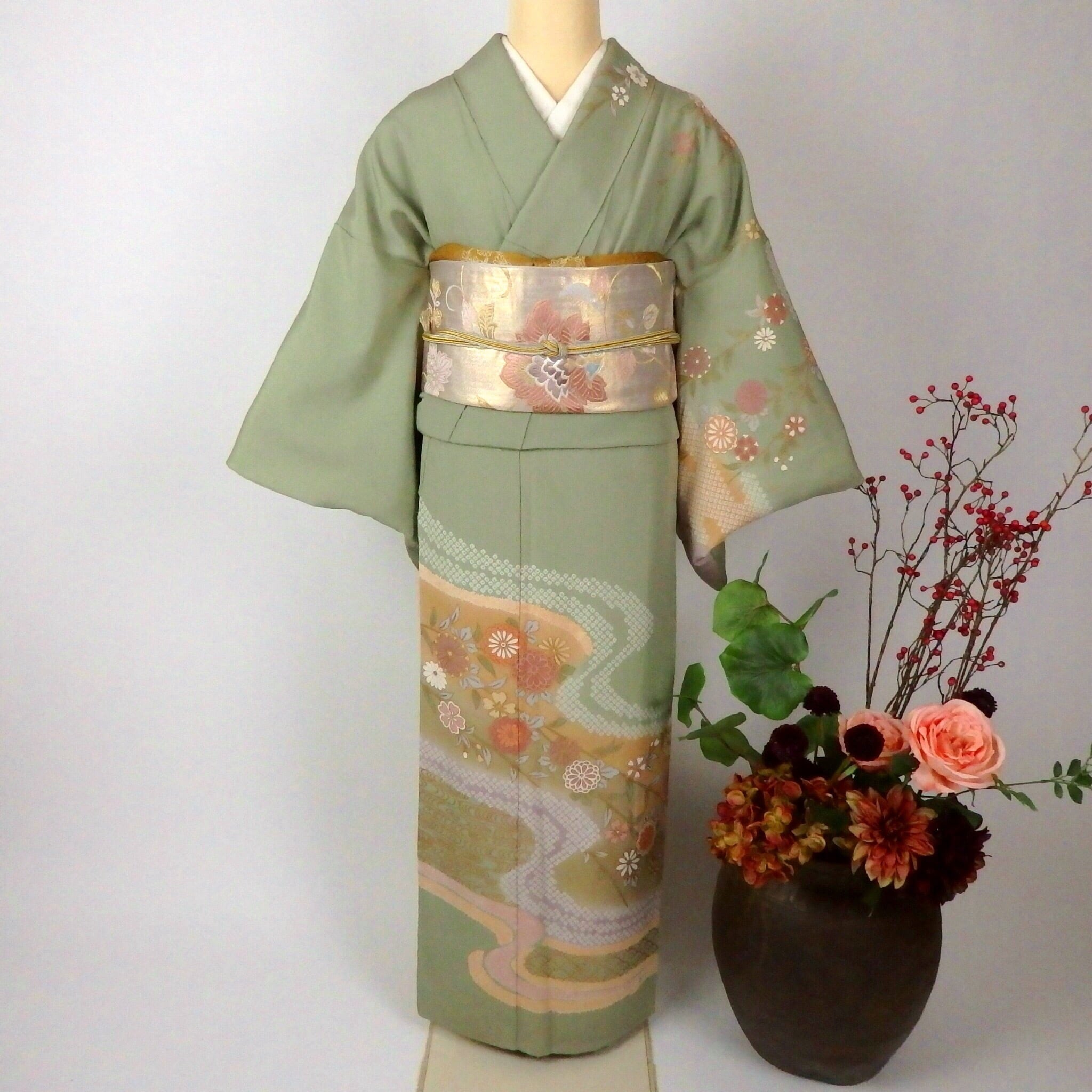 ◉着物… ウグイス色の地に枝ぶりとお花が美しい訪問着です。