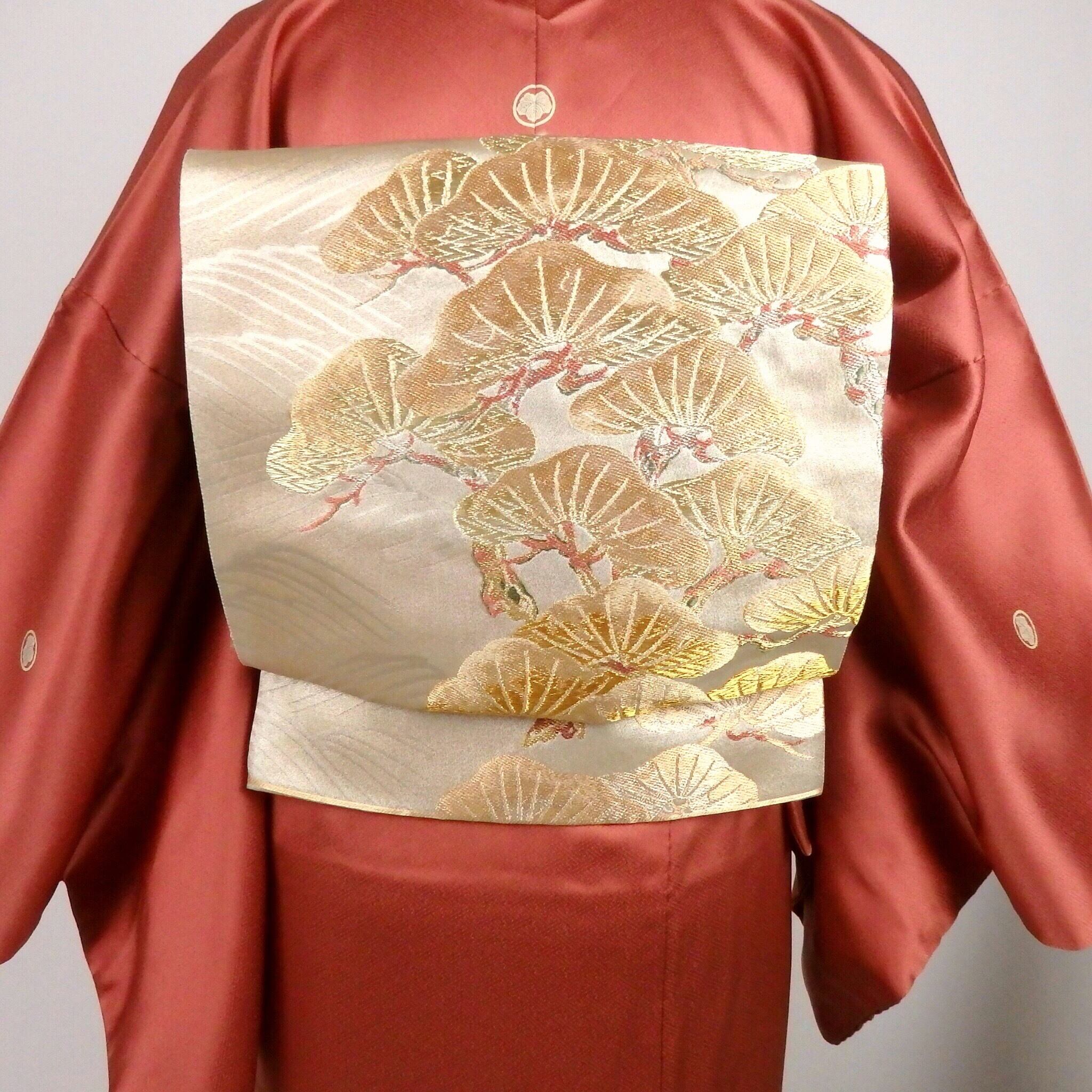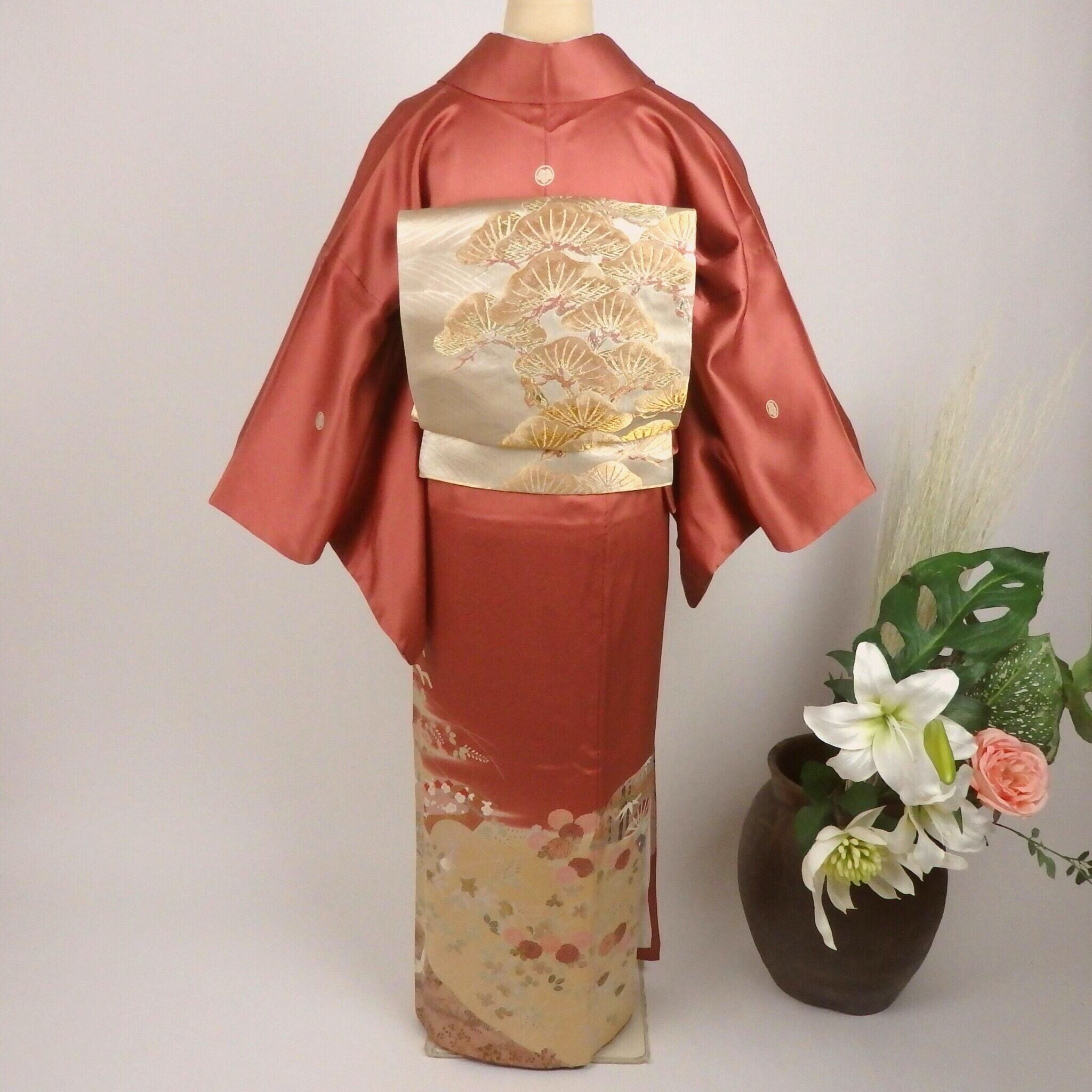 ◉着物… 濃いめのサーモンピンクに四季の草花、鶴が舞う豪華な京友禅色留袖です。