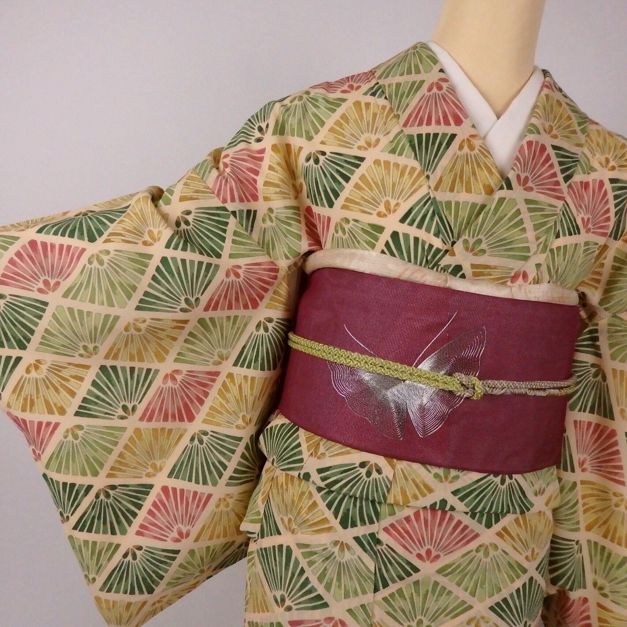 ベージュ地にピンクやグリーンで文様が描かれたカワイイ小紋です。