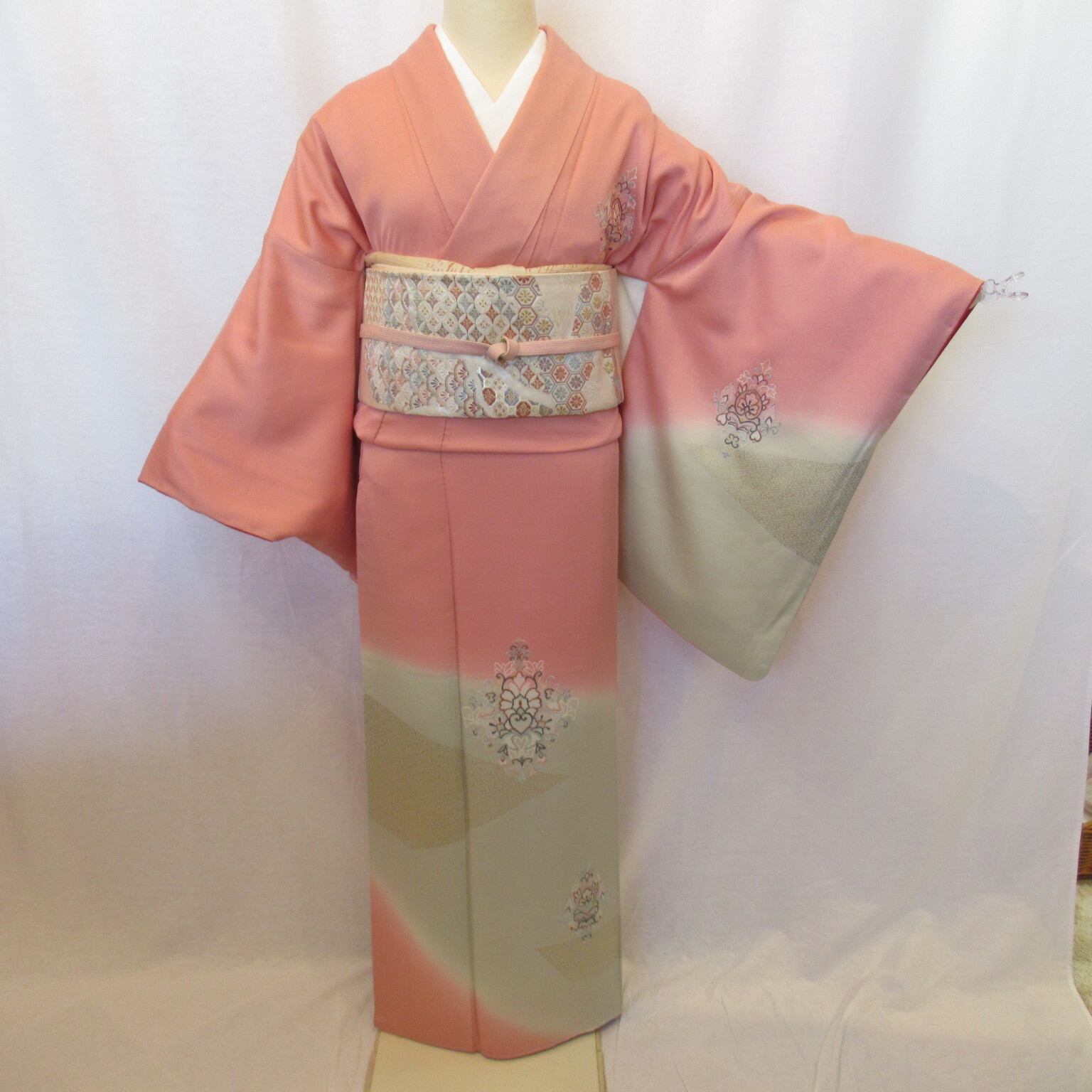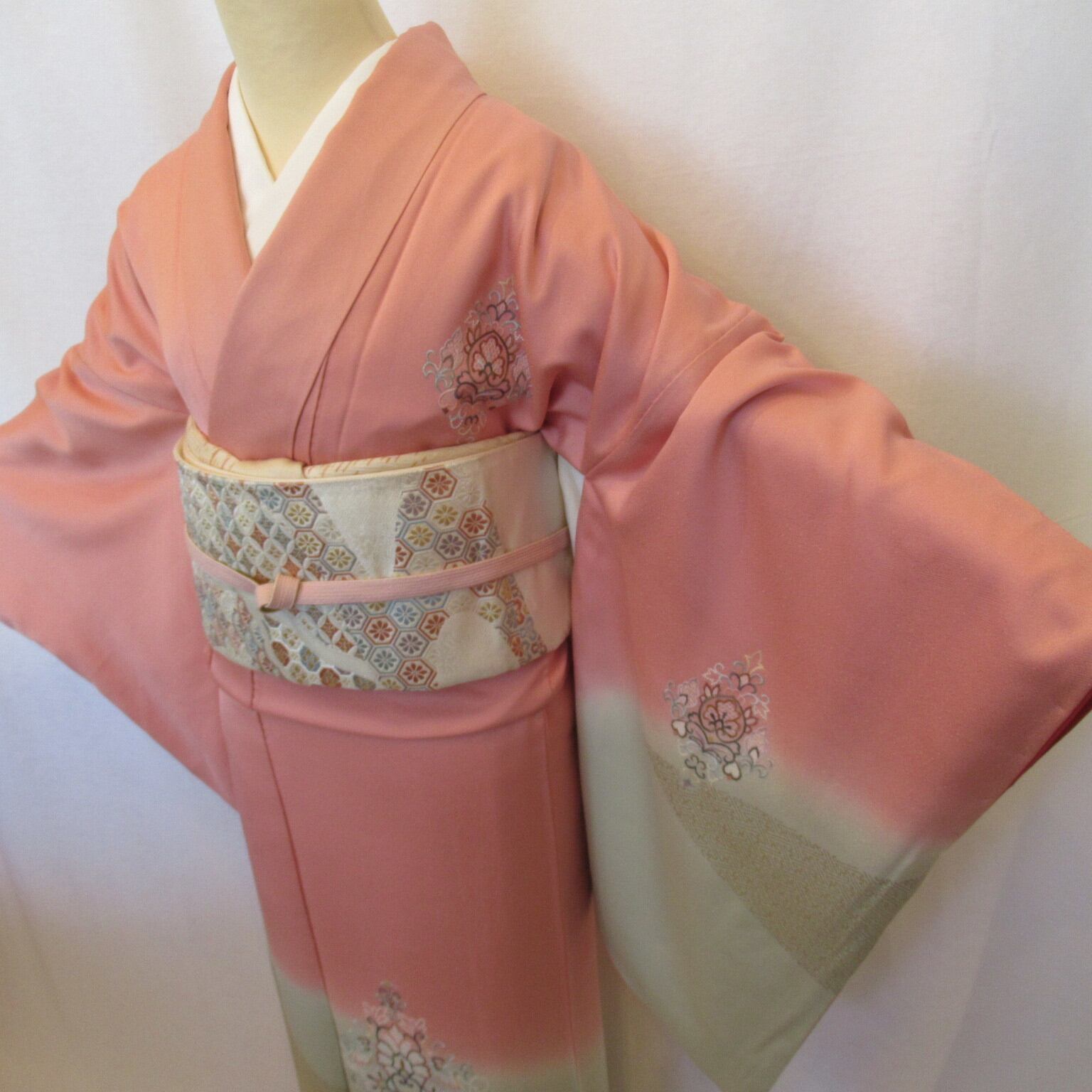 ◉着物…ピンクにベージュのボカシ、刺繍の文様が美しい訪問着です。