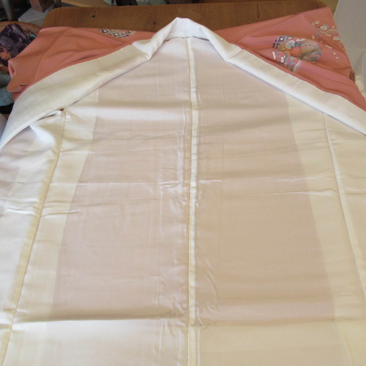 ◉着物‥サーモンピンクに里山の風景とお花が描かれた美しく可愛い訪問着です。