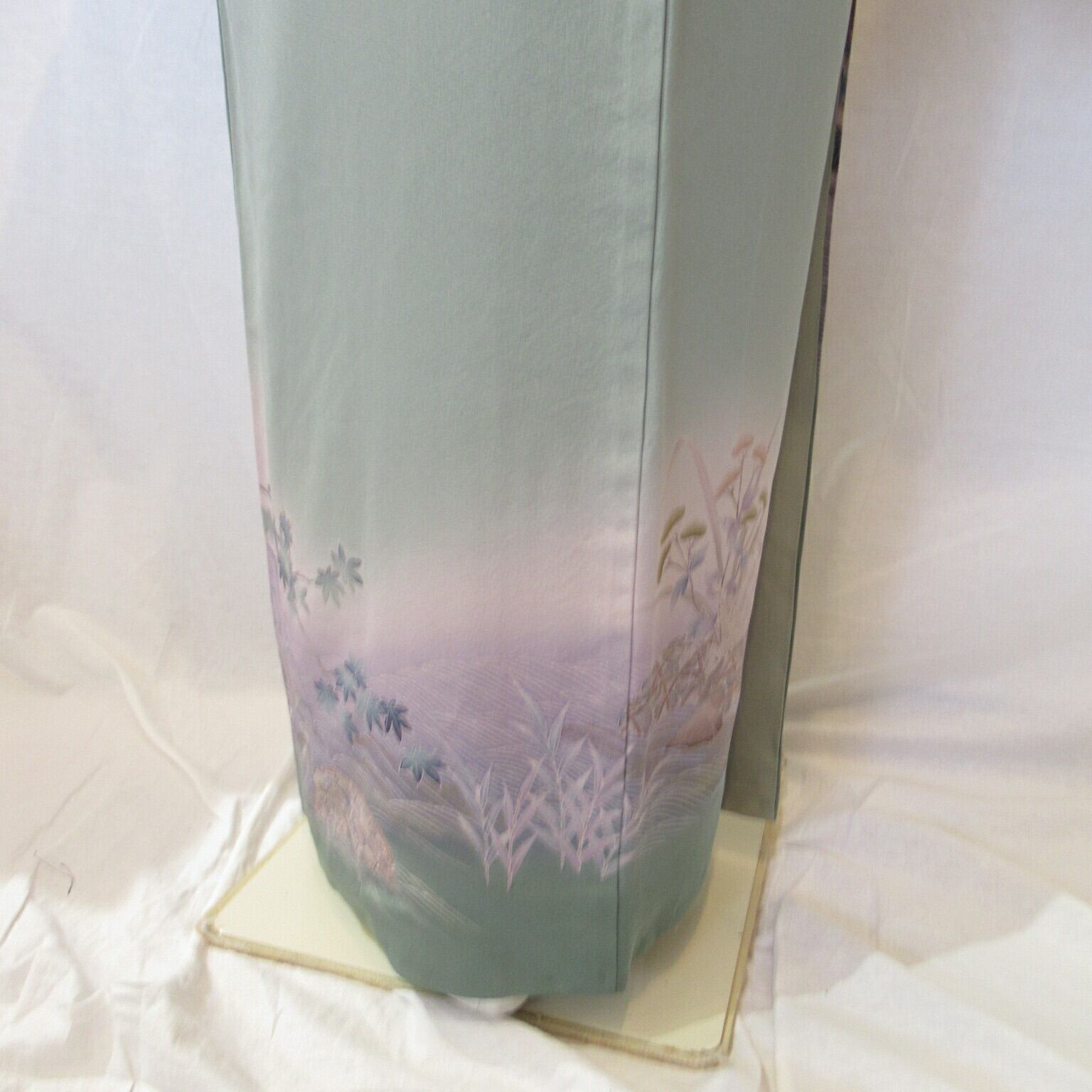 ◉着物‥青磁色と薄紫のボカシにお花と景色が上品で落ち着いた訪問着です。