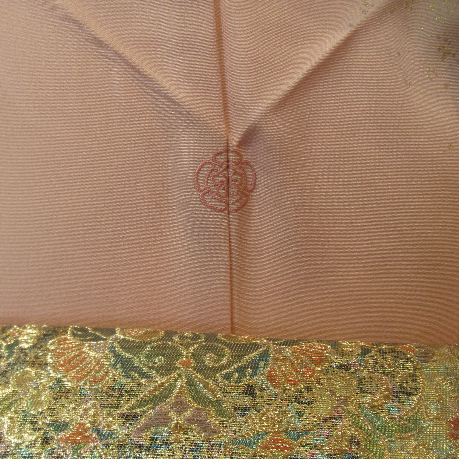 ⭐︎着物‥ 淡いピンクに草花文様と金箔が華やかさを添える上品な紋付き訪問着です。紋は五瓜に桔梗の刺繍紋です。