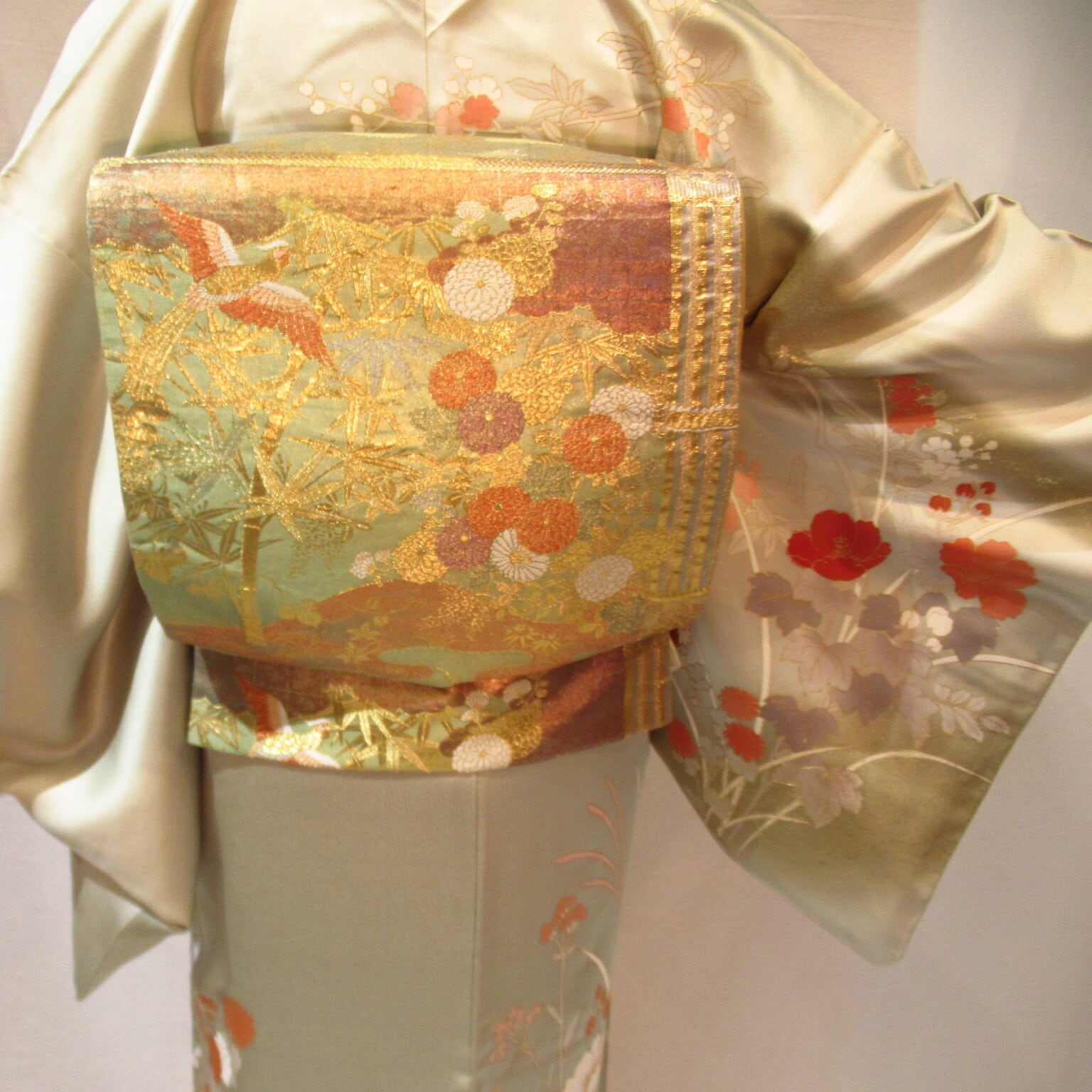 ⭐︎着物‥ 淡い抹茶色に四季折々の花が華やかで金箔が美しい訪問着です。