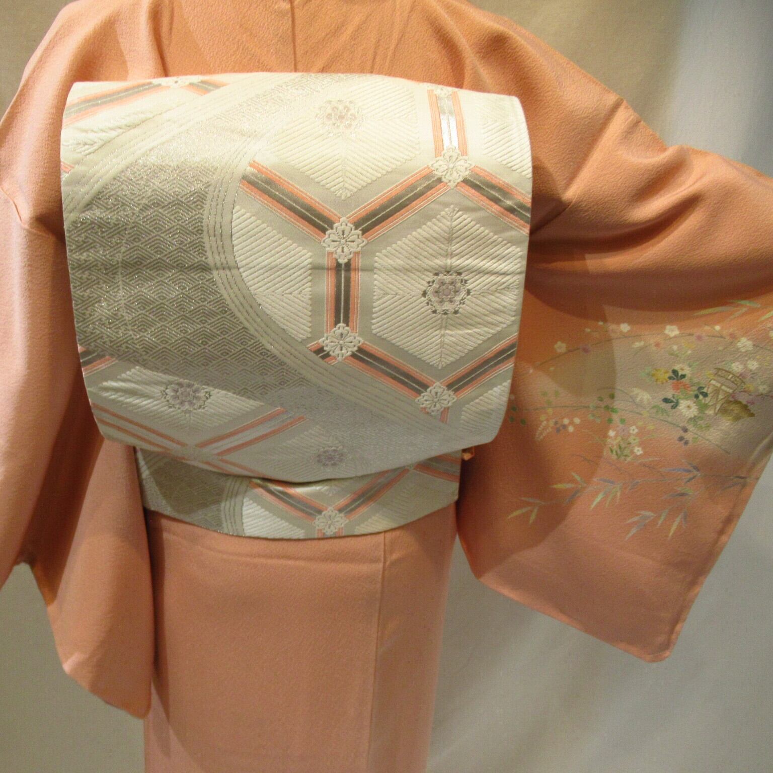 1819ピンク草花文様訪問着とエナメル箔袋帯セット