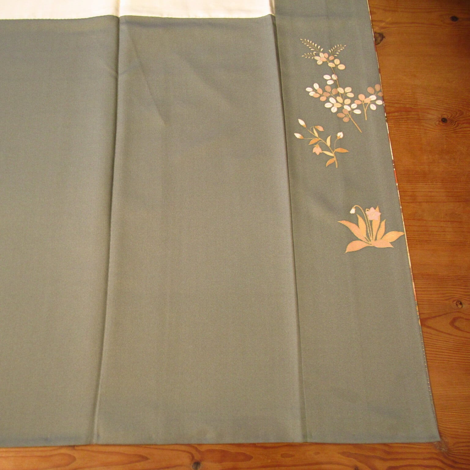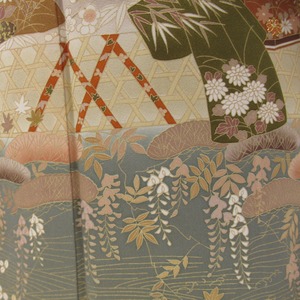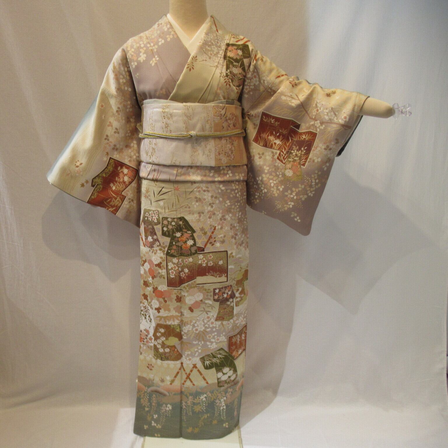 ⭐️着物‥ベージュとグリーンに四季の花や屏風、籠など吉祥文様の上品で落ち着いた