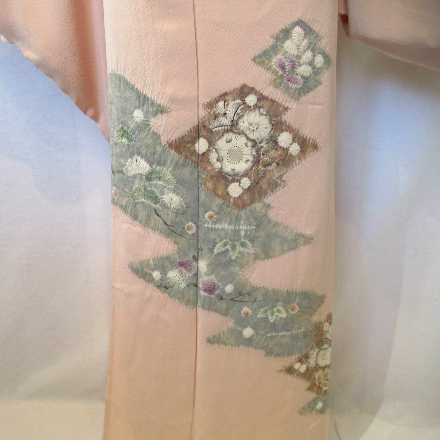 This is an unlined Houmongi with a beautiful Tsujigahana pattern in pale pink.