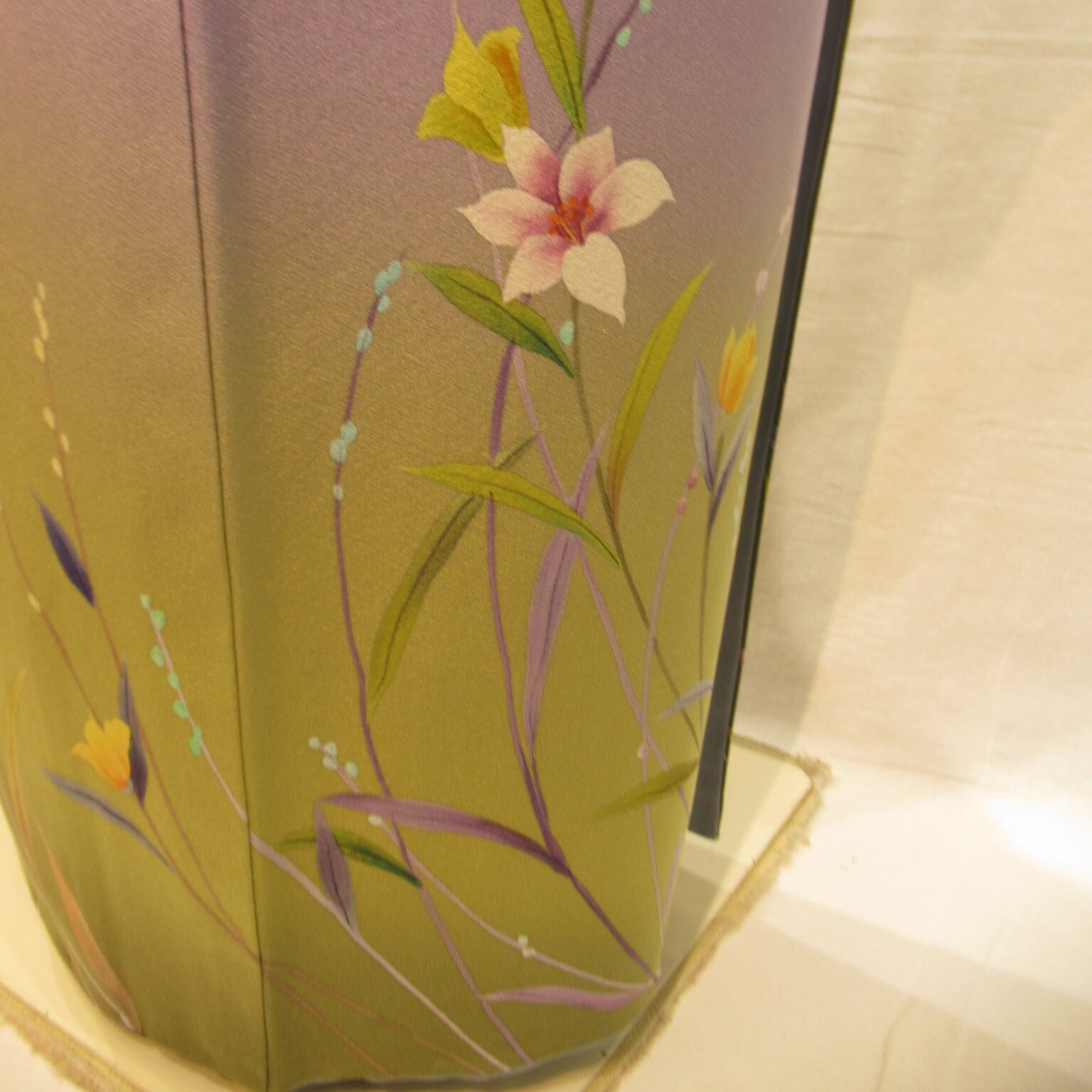 This is an artist's kimono with a beautiful gradation of blue-gray, purple, and yellow-green flowers.