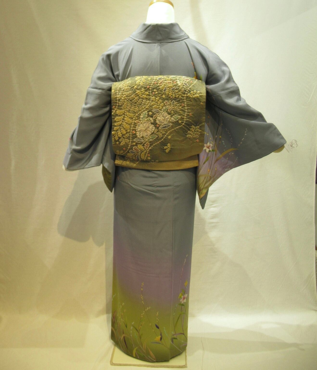 ⭐️ブルーグレーとパープル、黄緑色のボカシに手描きの草花がはんなり美しい作家物訪問着です。