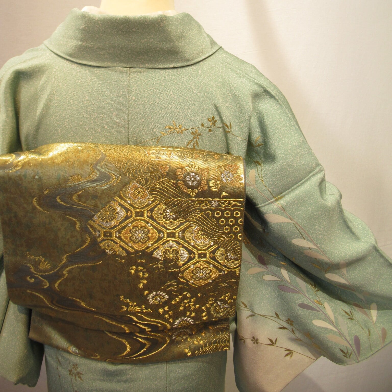 ミントグリーン地にたたきとボカシ、金箔が華やかで美しい訪問着です。