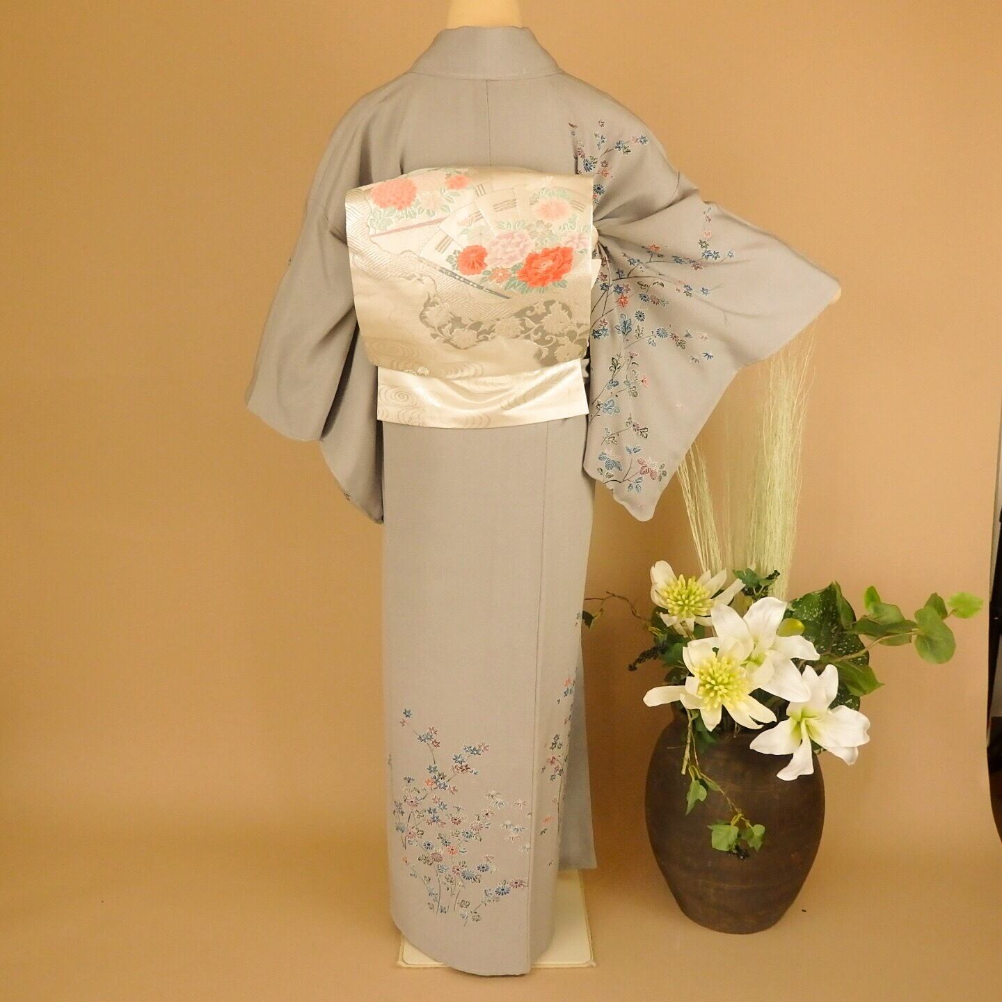 ◉着物… 淡いグレーに友禅染の草花が控え目な品の良い訪問着です。