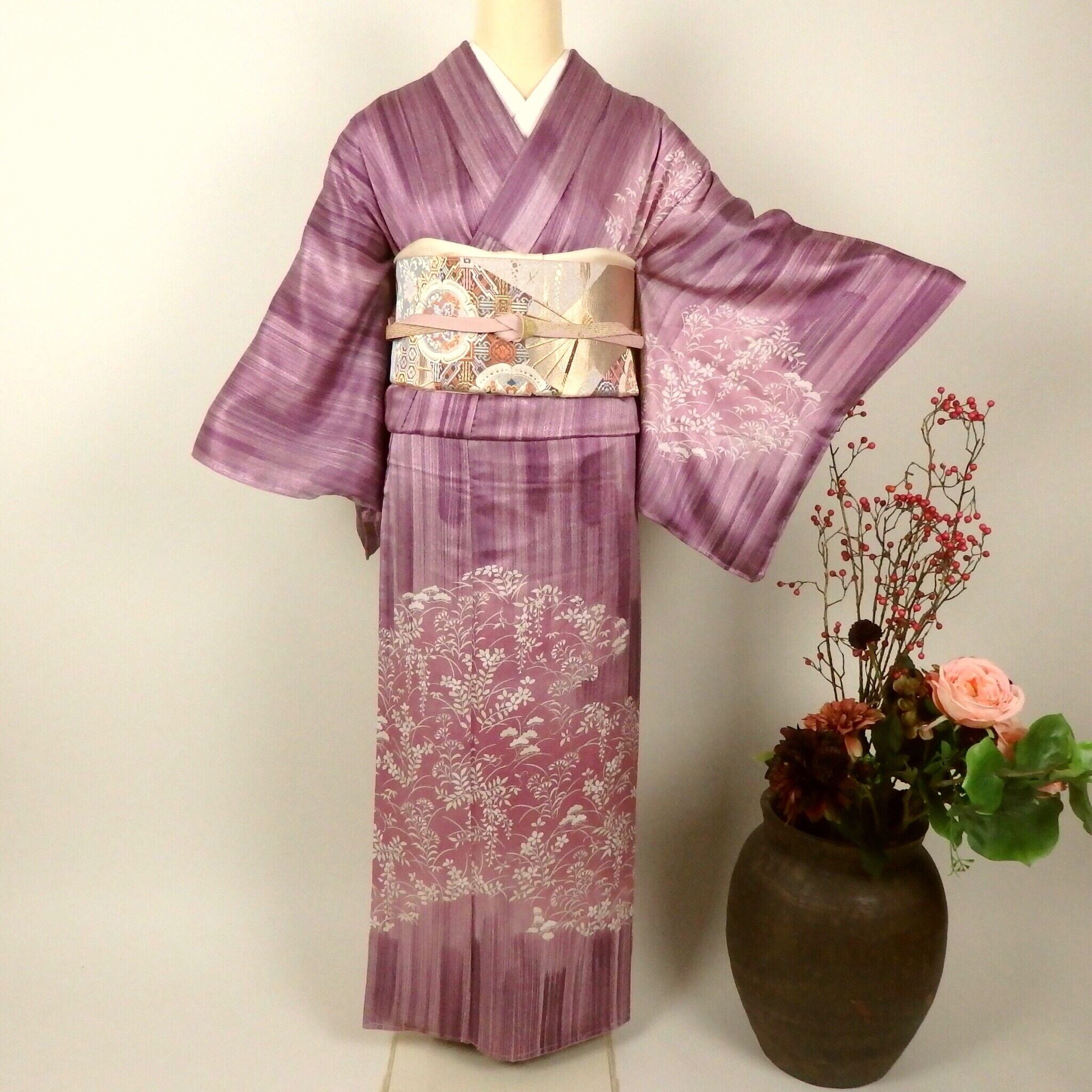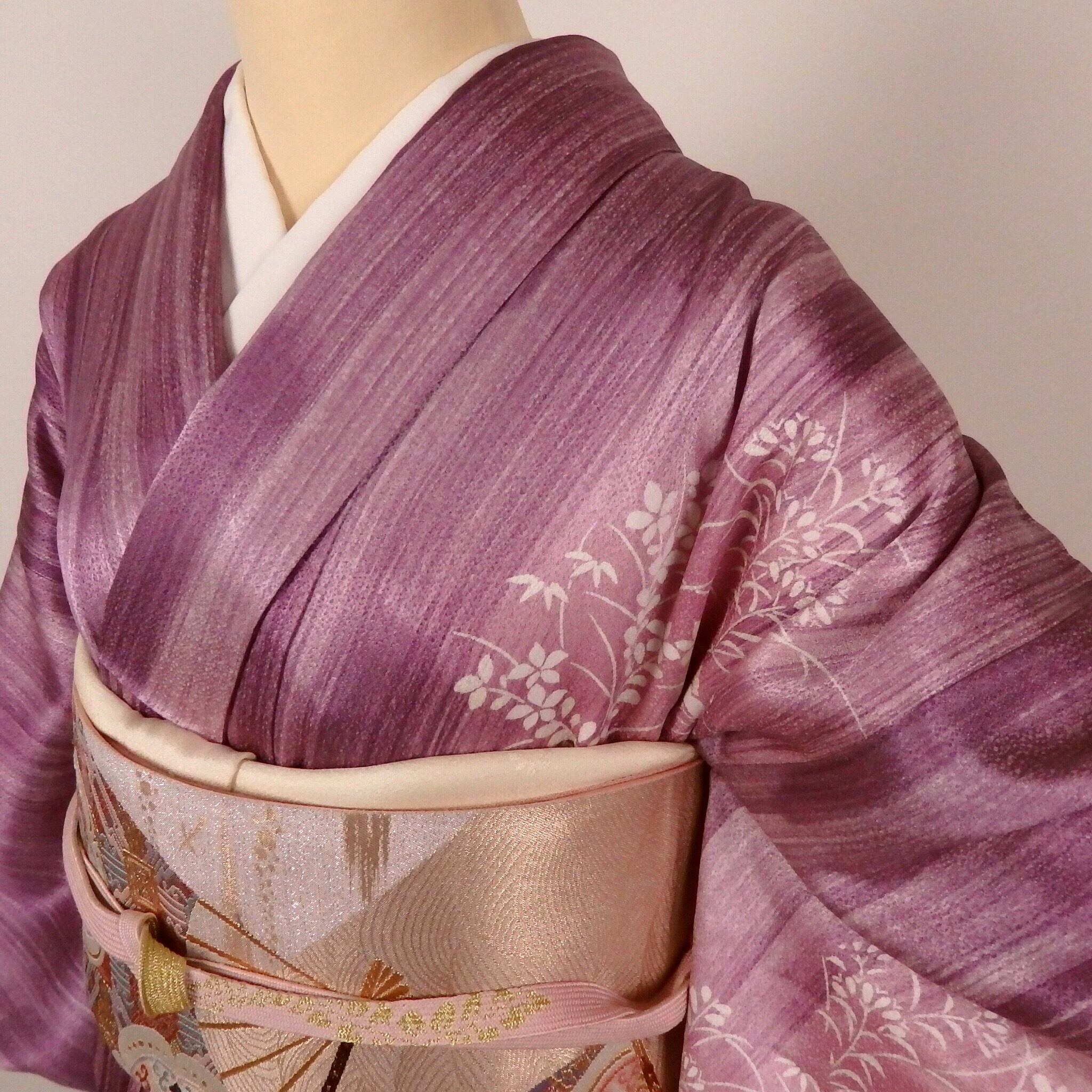 ◉着物… 紫系の縦ぼかしのはけ染に白の草花が浮き上がった訪問着です。